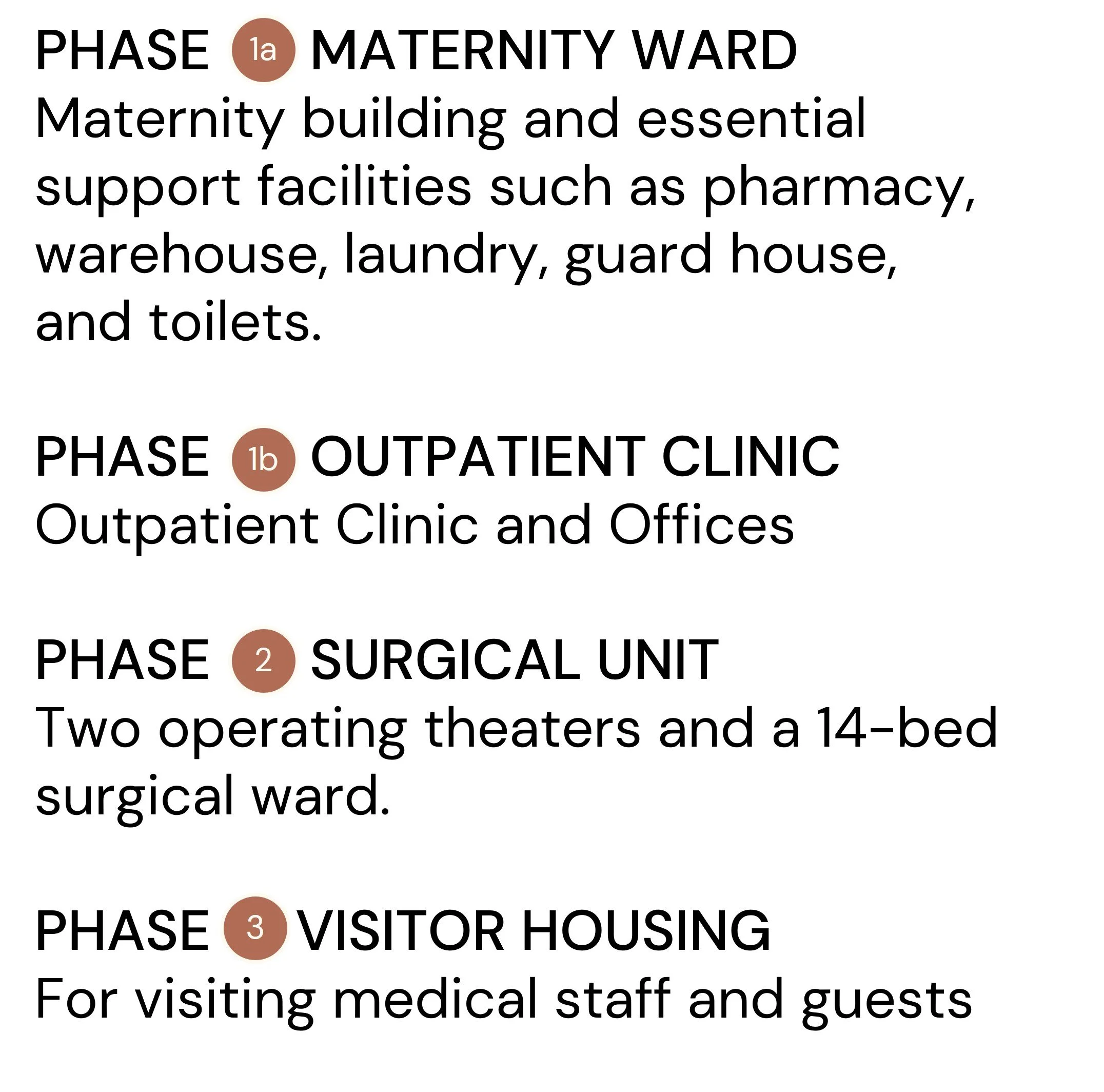 Focus on the maternity building as well as all the essential support facilities such as warehouse/ pharmacy, laundry, dining hall, guard house, and toilet block. During this phase, women requiring a C-section will be referred to the hospital in the next town.